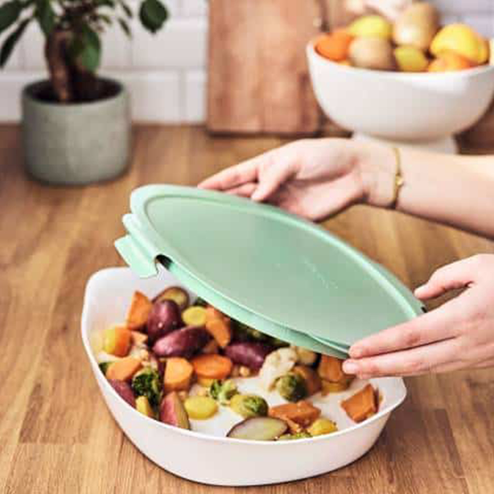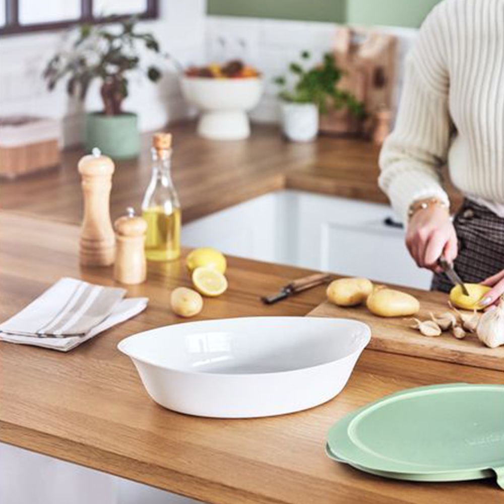 Disse robuste ovnsformene med porselensutseende er laget av herdet opalglass og er ideelle for tilberedning og servering av mat. Materialet er spesielt motstandsdyktig mot mekanisk og termisk belastning, noe som gjør den oppvaskmaskinsikker, ovnsikker opptil 250 °C og mikrobølgeovnsikker. Den er mer støt-, slag- og bruddsikker, samt ripebestandig, enn porselen.