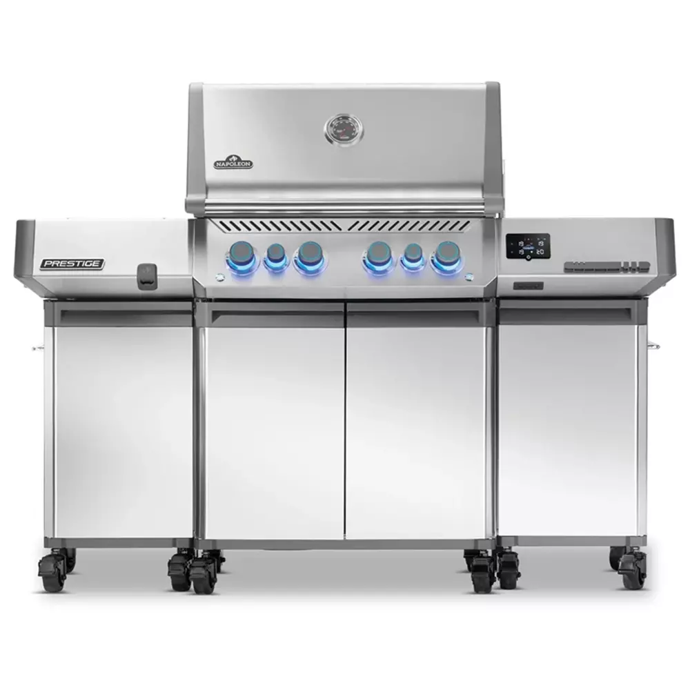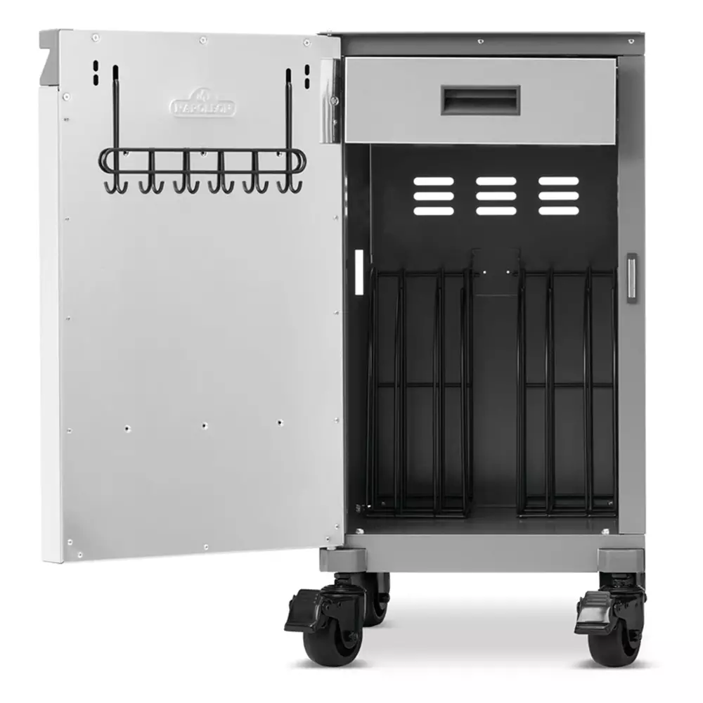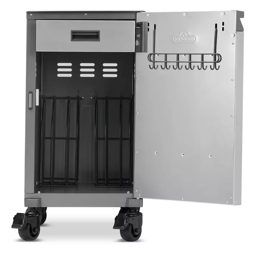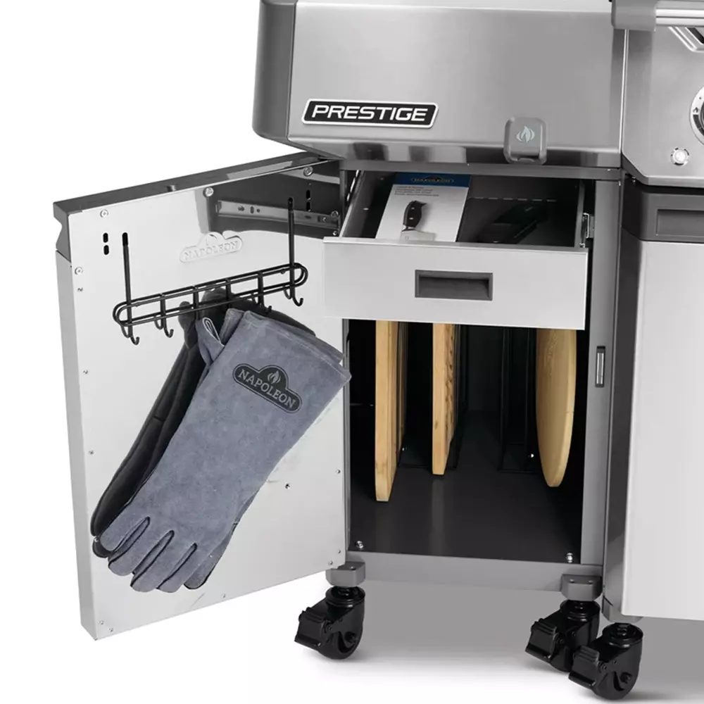 Oppgrader din Napoleon Prestige® grill med dette elegante sidekabinettet i rustfritt stål. Med en praktisk uttrekksskuff på toppen, integrerte opphengskroker og et stativ for oppbevaring av for eksempel skjærebrett, får du ekstra plass og orden i utekjøkkenet ditt. Kabinettet kan plasseres på både høyre og venstre side av grillen og matcher perfekt med Prestige®-modellens design. Et must-have for enhver som vil ta utekjøkkenet sitt til neste nivå.