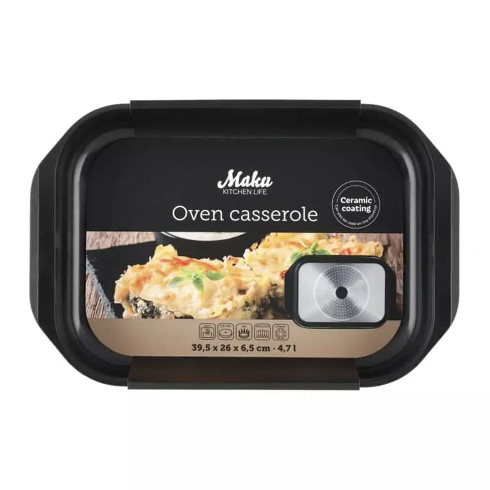 Ovnsform som også passer for alle typer komfyrer, kan også brukes på komfyrtoppen. Formen kan brukes til forkoking i stedet for stekepanne for å redusere skitten oppvask. Også egnet til servering av mat. Non-stick overflate, enkel å rengjøre. Kapasitet 4,7 L. Varmebestandighet maks. 350 grader. Håndvask.