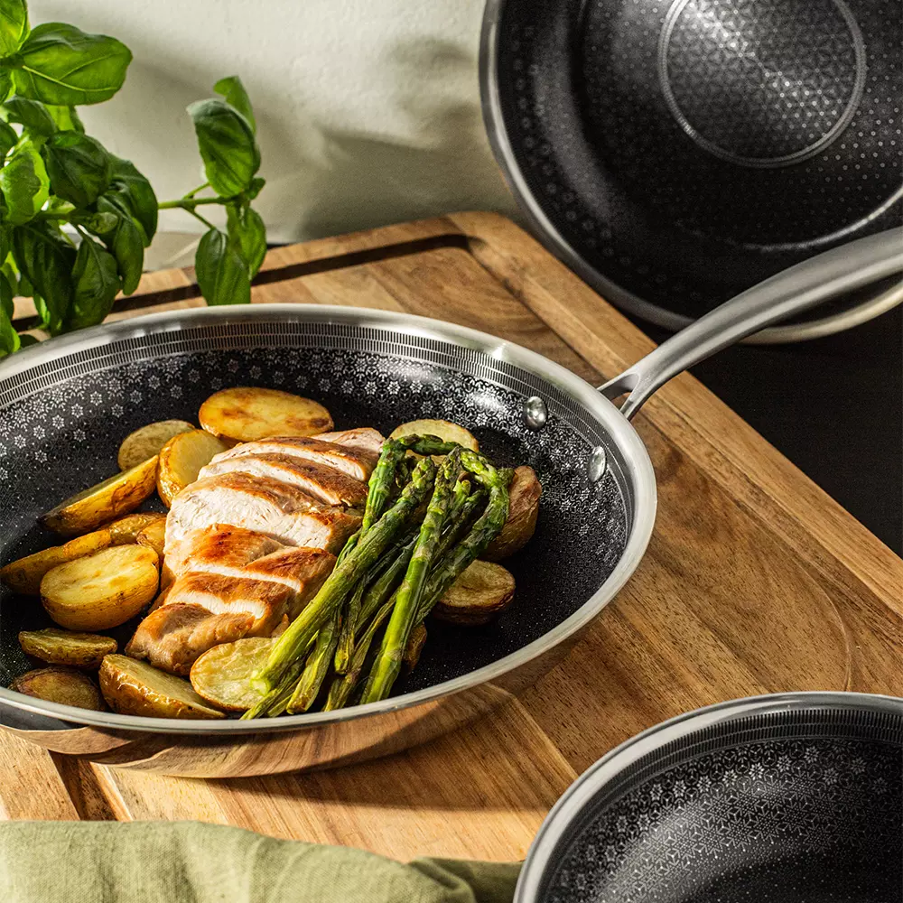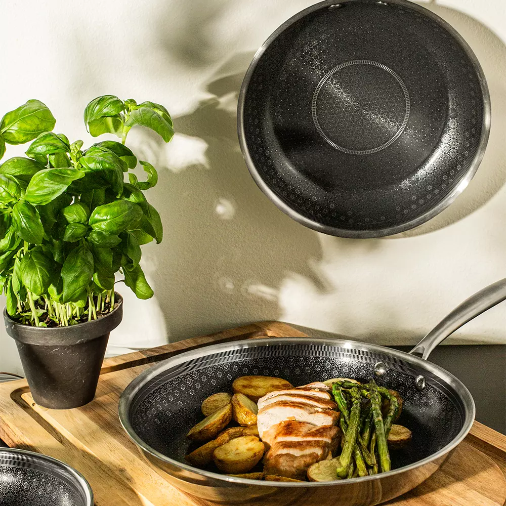 Stekepannen er laget av resirkulert rustfritt stål, og kombinerer funksjonell design med kompromissløs kvalitet og ytelse. Den keramiske KFCC-belegget gir en slitesterk overflate som er fri for PFAS-stoffer, mens den strukturerte ståloverflaten forhindrer slitasje. Den beskyttende stålstrukturen gjør stekepannen ripebestandig mot alle typer kjøkkenredskaper. Triply-konstruksjonen sikrer jevn og effektiv varmefordeling som fungerer på alle varmekilder, inkludert induksjon. Stekepannen er produsert i Frankrike.